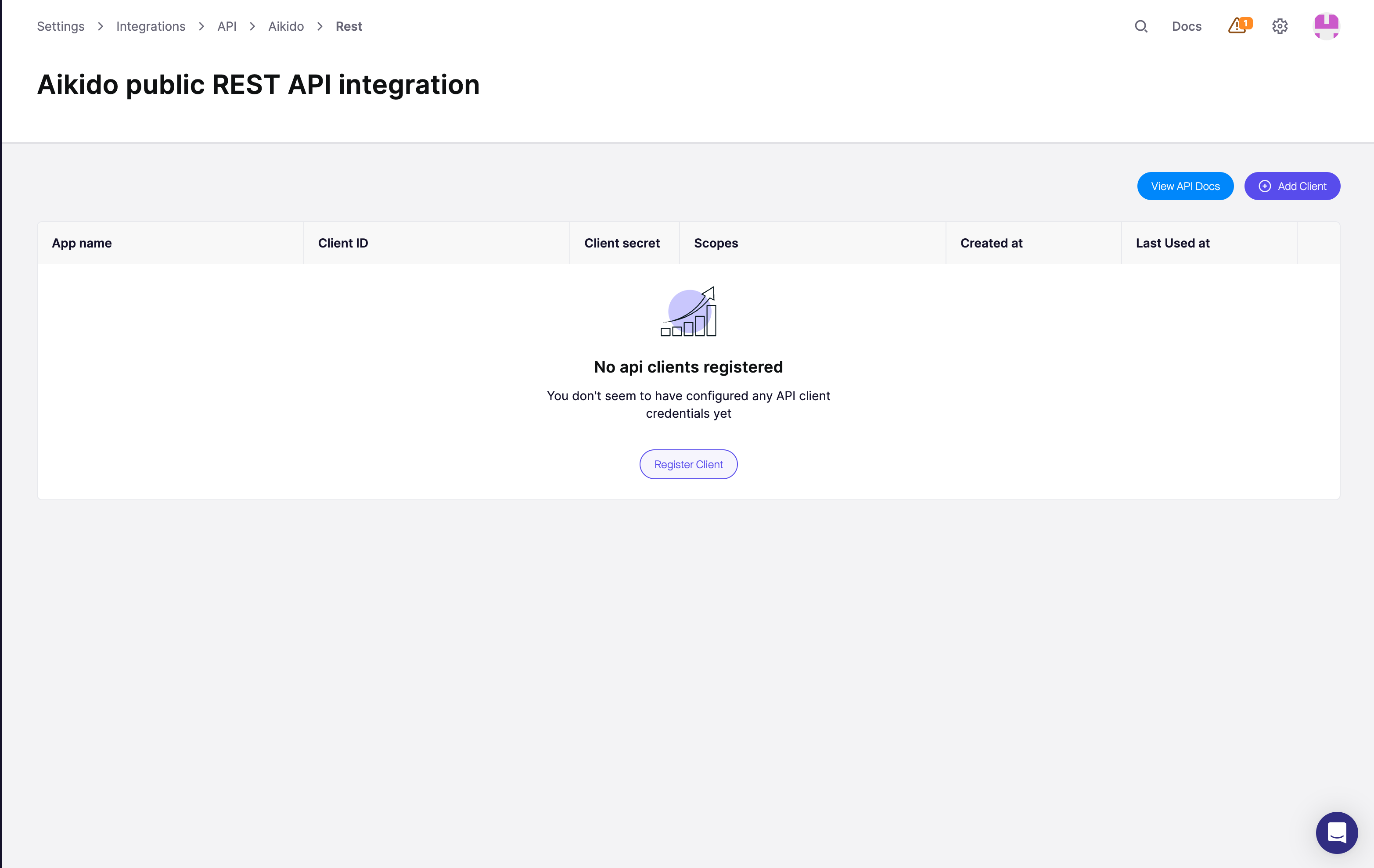 From your Aikido settings, navigate to Aikido public REST API integration.Here, you can see a list of existing API integrations. If you already have an private app with the required permissions, you can use that. Otherwise, click on the Add Client button to create a new one.