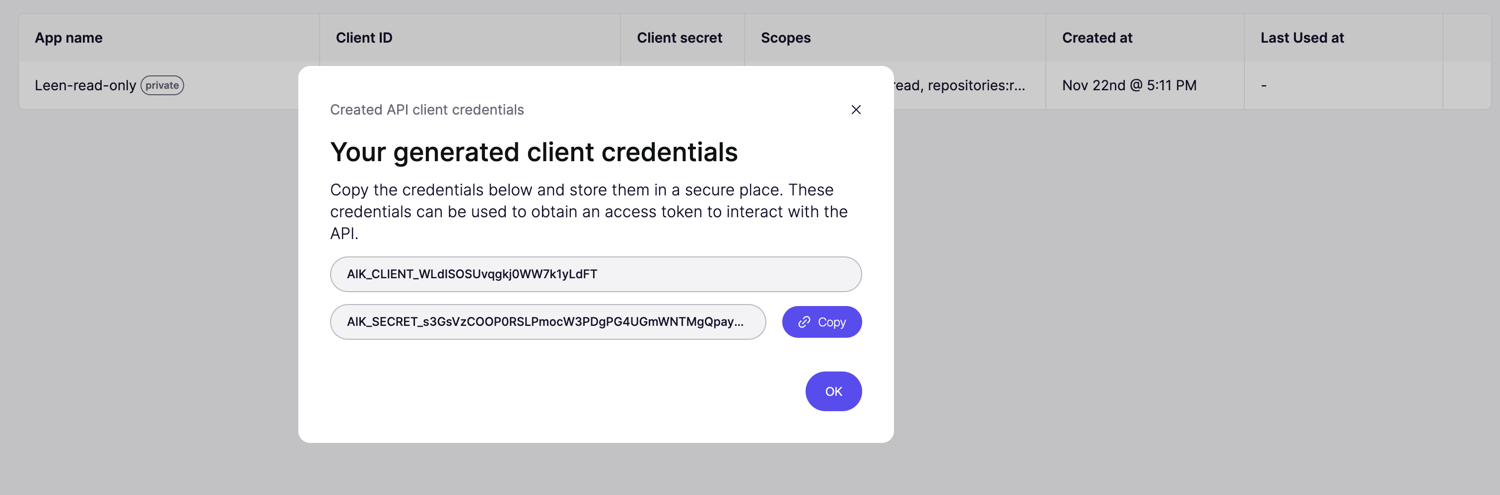 After selecting the permissions and generating credentials, copy the Client ID and Client Secret, and use those to create a new connection in Leen.