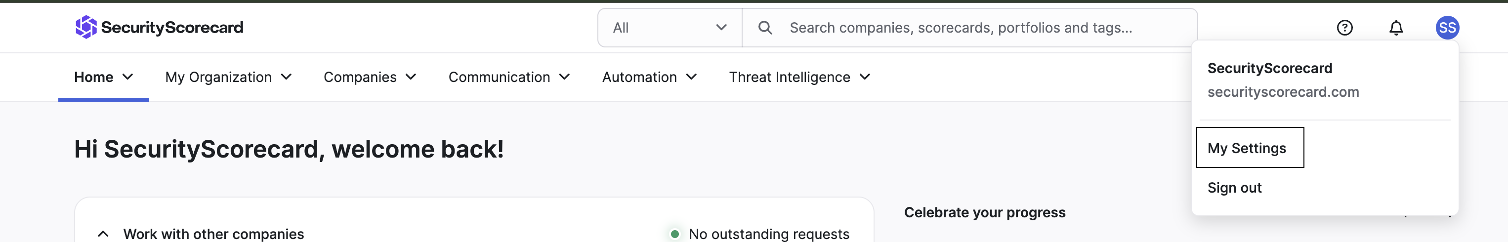 Log in to your SecurityScorecard platform using an account with appropriate permissions to generate API tokens.