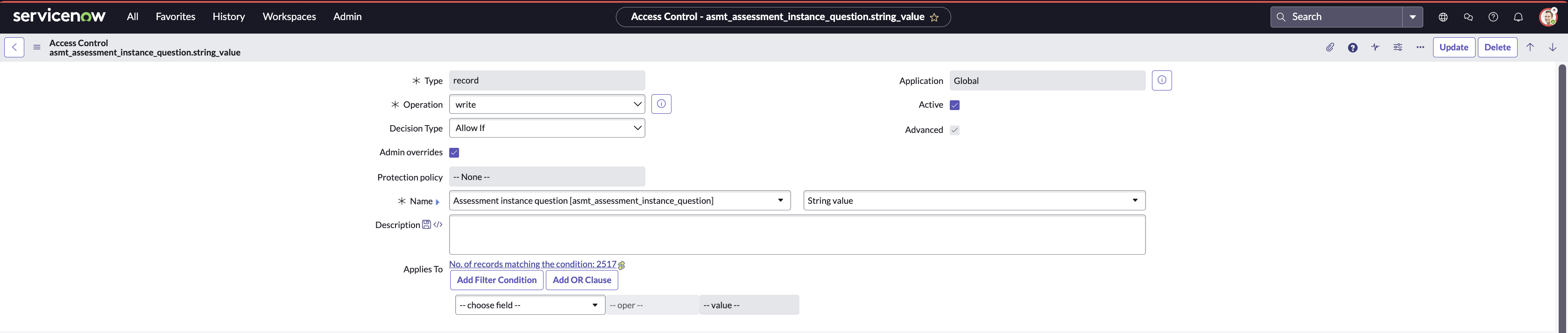 ServiceNow applies Access Control Lists (ACLs) at both the table and column levels to provide fine-grained control over which users can read or write specific fields. By default, the asmt_assessment_instance_question table includes an ACL for the value column (used for numeric or integer-type responses), but no ACL is defined for the string_value column, which is required to capture assessment responses that are of type string. Without this ACL, the integration user will not be able to submit or update string-based responses programmatically. To resolve this, we must manually create an ACL for the string_value column, using the existing ACL for the value column as a reference. Prerequisite: User should be elevated to security_admin role.Steps to create ACL for string_value: