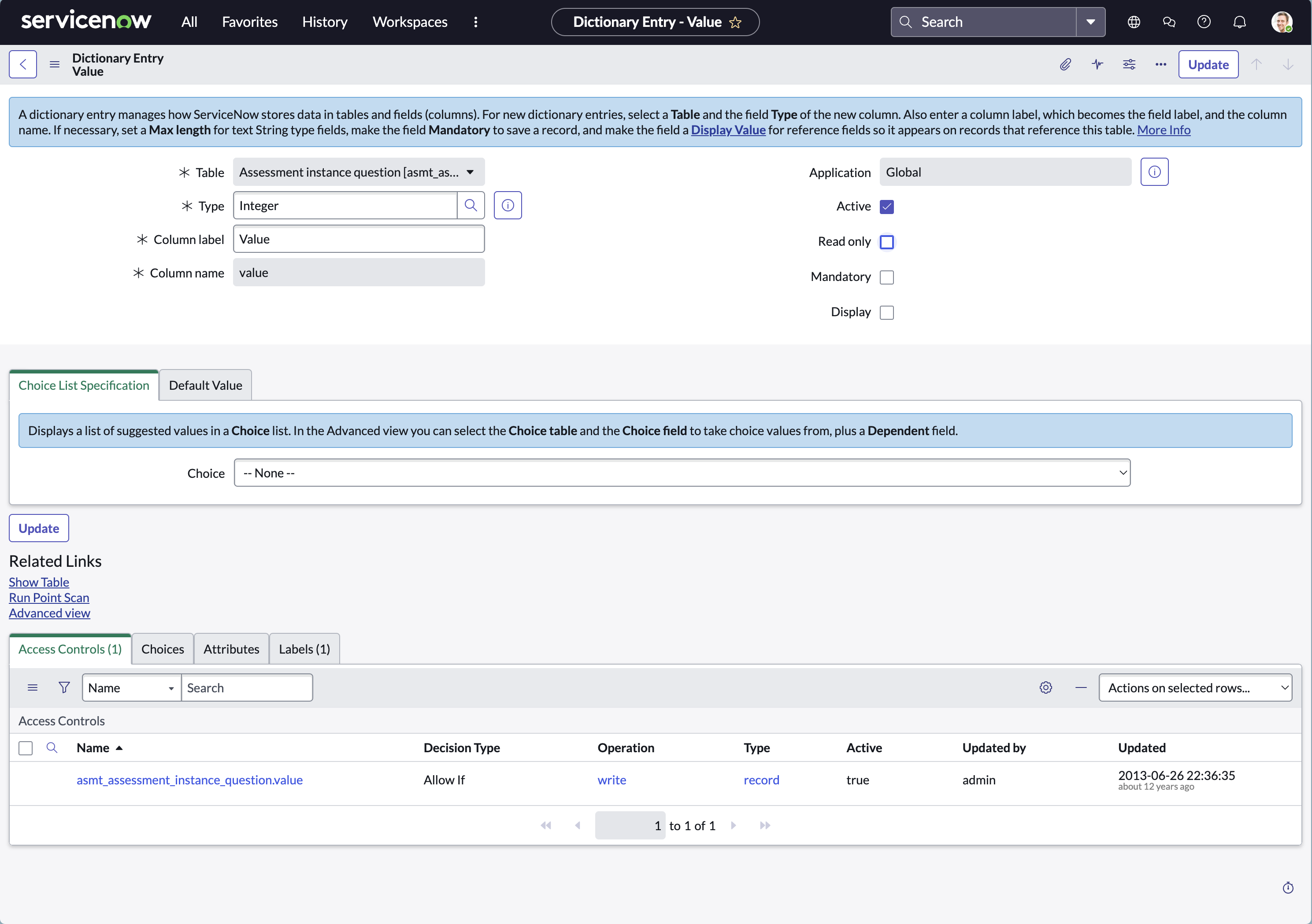 By default, certain assessment-related fields in ServiceNow are read-only, preventing API-based updates.To enable Leen to record assessment responses, you must uncheck the Read-only property for specific fields.